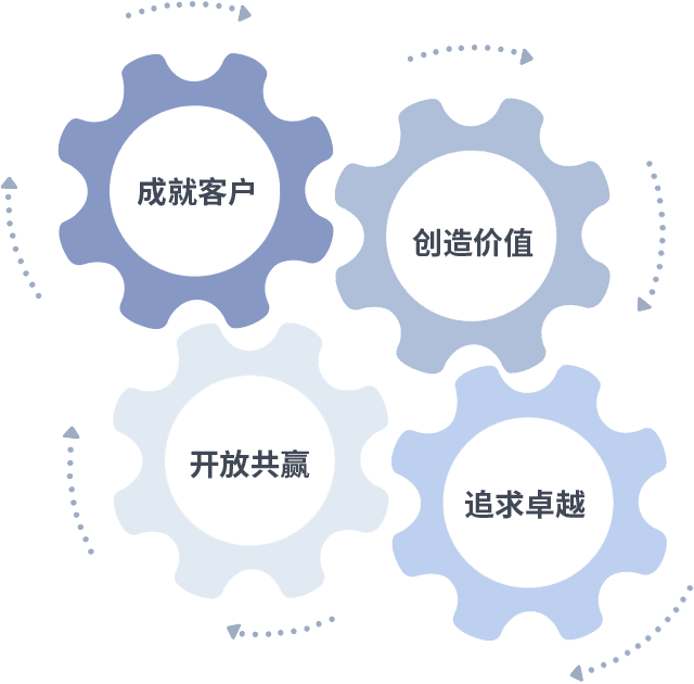 成就客户是一切决策的出发点,,,,创造价值是衡量所有工作的标准,,追求卓越是我们做事做人的态度,,开放共赢是我们的格局也是最终的结果。。。。价值观的齿轮环环相扣,,,,推动着组织里的每个人不断向前。。