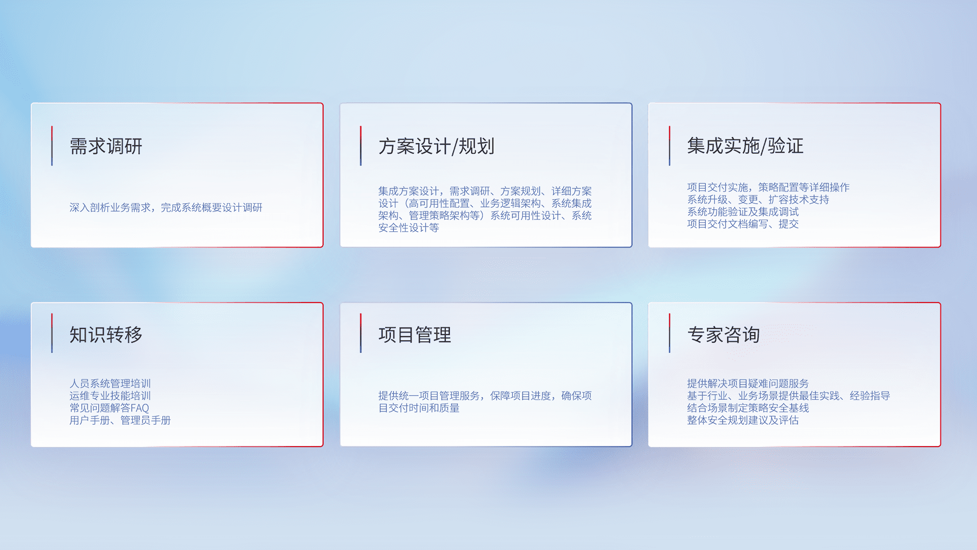 针对客户行业特性,,将宏观的安全战略和需求,,通过专业的交付服务,,实现项目落地,,,为客户提供标准规范的集成交付服务。。。
